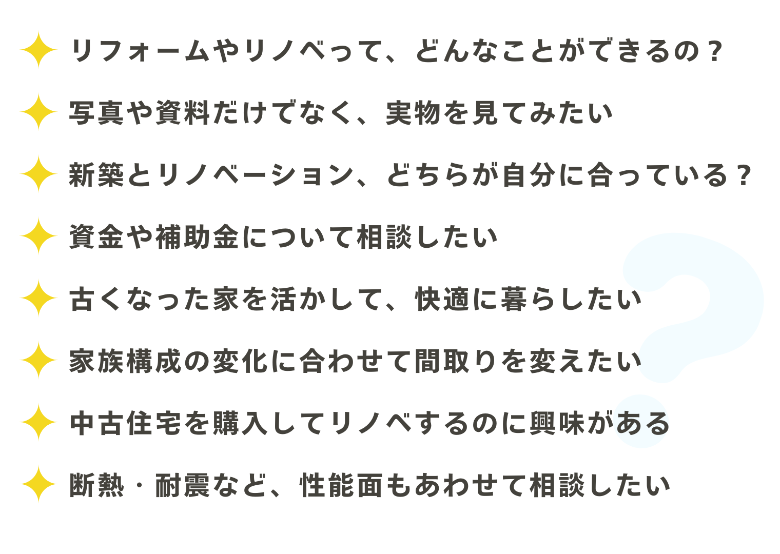 リフォームやリノベーションを考えはじめて具体的なことはわからないけど、話を聞いてみたいという方でもお気軽にご相談ください!