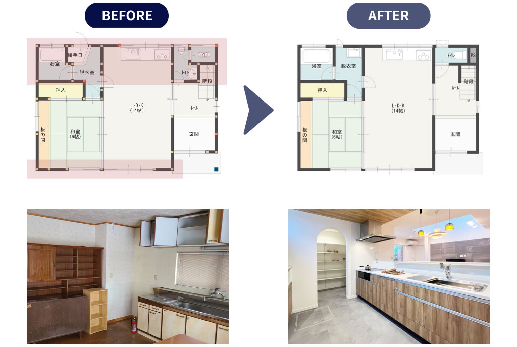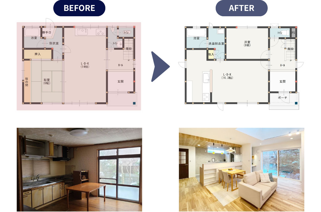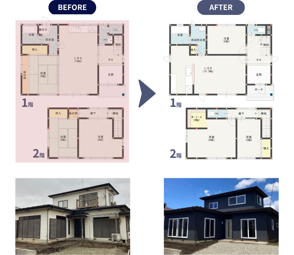 間取り、内装、外観すべてを一新し、新築のように再生させるプラン例です。1階だけでなく、2階にも断熱改修を施して、家全体を快適空間に造り変えます。