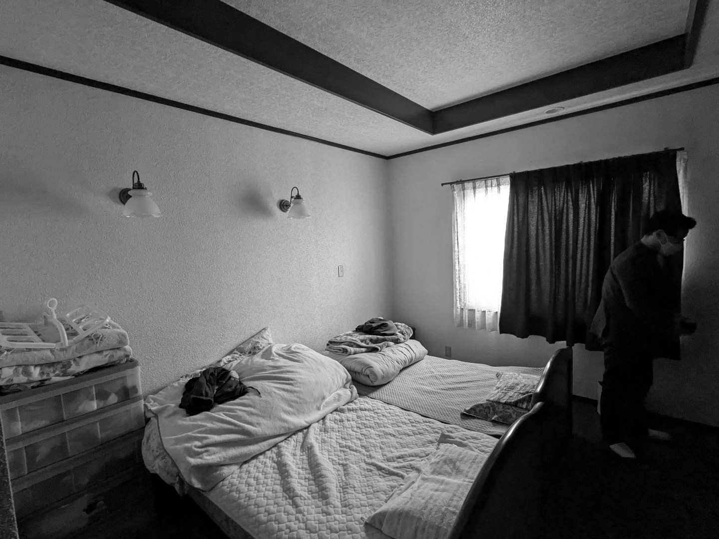暗さや収納不足が気になっていた寝室に棚とワークスペースを設け、明るく落ち着いた空間に整えました。